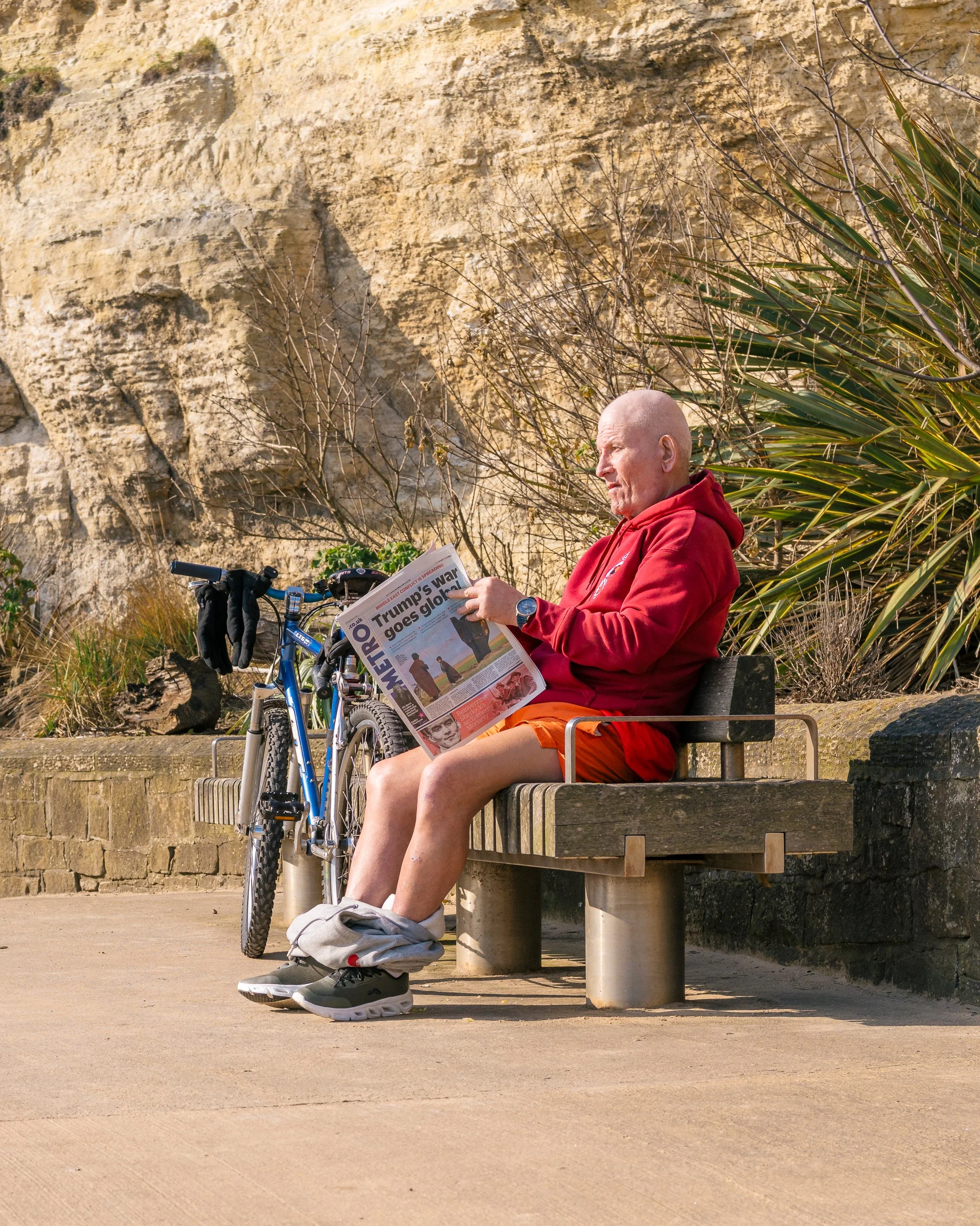 To warm myself up, I headed back towards dry land with the plan to have a quick wander around Roker Park. It was heading towards the entrance of the park I stumbled across what may be my favourite image of the day. I’m not really a street photographer but I do try and grab the odd image of people going about their day. My neurodivergent brain really isn’t keen on confrontation and isn’t at its best when engaging in chit-chat should someone come over to ask what I’m doing. I know that it is not common for people to go full on radgie (local dialect for someone losing their temper and being aggressive) as most people are too busy just getting on with their lives. Even so, it is not my forte. However, it was someone sitting reading their newspaper that gave me my favourite image of the day.